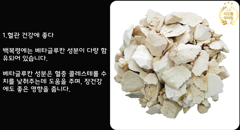 백봉령 백복령의 효능이 불면증에 도움이 되고 심신 안정에 좋다고 합니다. 식이섬유도 풍부해서 설사에도 좋고 장 건강 개선에도 도움이 된다고 합니다. 그리고 비타민 성분도 많아서 피부 개선에도 도움이 되고 더 탄력있게 만들어 줍니다. 그리고 또 하나 혈당치 개선에도 도움이 되는 부분이 있다고 하니까 여러 방면에서 섭취할 수 있다고 합니다.