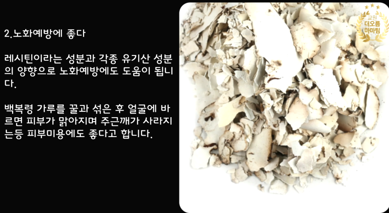 그리고 과거에도 백봉령 백복령의 효능은 널리 알려져 있었기 때문에 과거에 왕의 차를 끓이는 데에도 사용되었던 재료라고 합니다. 특히 최근에는 기력 회복에 좋은 건강식품 관련 제품의 함유 재료를 보면 백복령을 확인할 수 있을 정도로 다양하게 사용되고 있습니다.