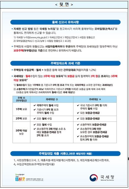 또한 주택임대차소득세 신고를 하기 전에 한 가지 유의할 점은 과세 대상과 함께 인정되는 범위입니다. 소유한 주택의 수에 따라 세금 책임이 달라집니다. 현재 여러 사람이 소유한 주택은 세금이 면제될 수 있지만, 자신이 소유한 주택이 시가 기준으로 9억원을 초과하거나 해외 주택인 경우 세금이 부과된다. 그래서 1채의 주택을 소유하고 있다면 단순히 모든 주택에 대해 세금 면제를 받을 수 있다고 생각할 수 있습니다.