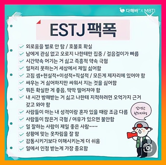 안녕하세요. 매일 더 나은 사람이 되고 싶은 푸른 연못입니다. 오늘은 한국인에게 MBTI 성격 유형 중 두 번째로 많은 ESTJ 성격 유형(15%를 차지)과 이들의 연애 궁합에 대해 알아보겠습니다. ESTJ Etje E- 외향적(외향적) S – 감각(감각) T – 생각(사고) J-판단(판단) 이 네 가지 키워드는 ESTJ 에티제의 특징을 설명합니다. 1. ESTJ 남성 성격 특성